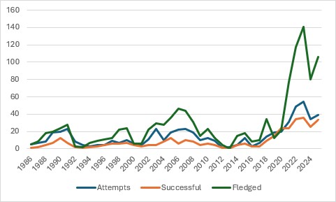 We did not record any second breeding attempts in 2025. Therefore, it is estimated that there was a minimum of 39 breeding females in England (34 in 2024).